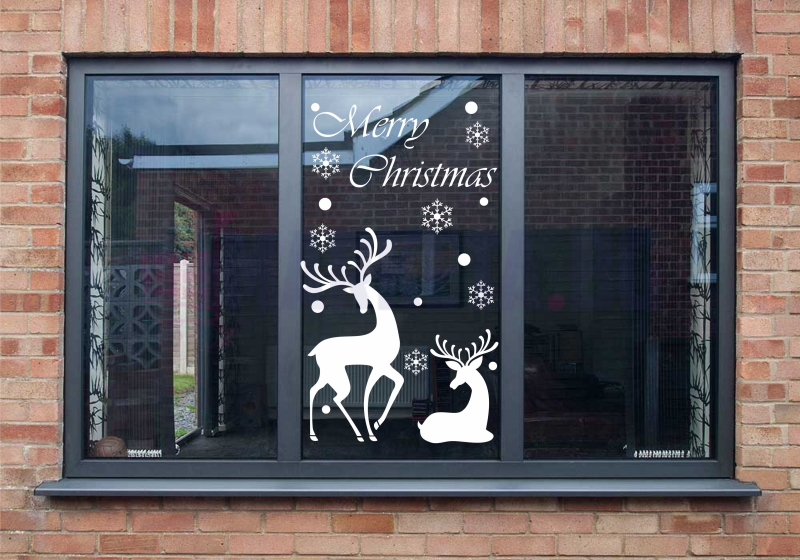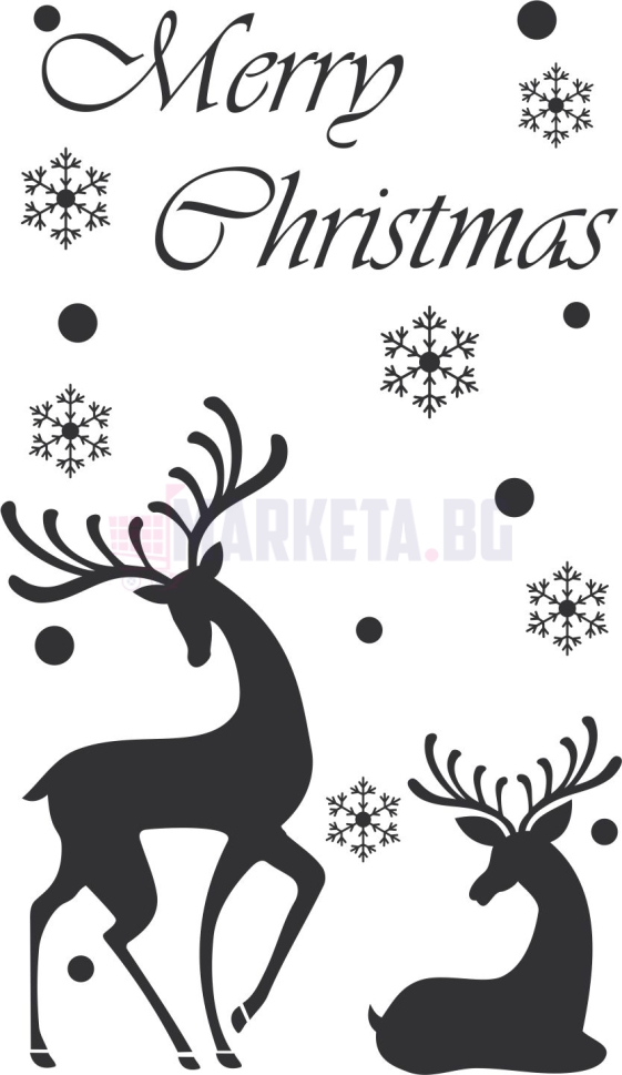Стикер "Merry Christmas и Коледни Елени". Изработва се от рязано по контур ПВЦ фолио с транспортна лента за лесно залепване. Стикера е подходящ за външни условия и се монтира директно на външни стъкла. Препоръчваме закупуване на ракел за залепяне на фолиа при декорация на Коледните витрини. За различни размери и надписи може да се свържете с нас на тел. 02 927 83 83.