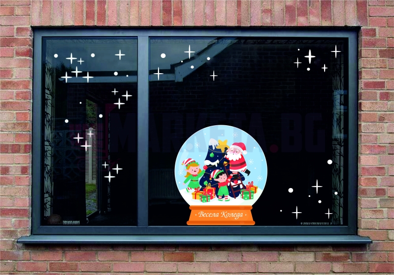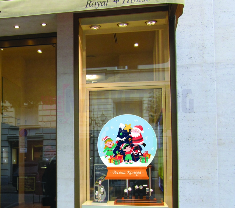 Коледен стикер. Изработва се от рязано по контур ПВЦ фолио с транспортна лента за лесно залепване. Стикера е подходящ за външни условия и се монтира директно на външни стъкла. Препоръчваме закупуване на ракел за залепяне на фолиа при декорация на Коледните витрини. За различни размери и надписи може да се свържете с нас на тел. 02 927 83 83.